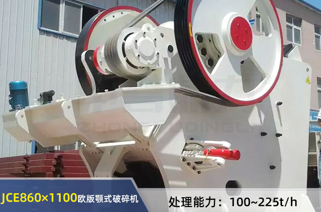 JCE860×1100欧版颚式破碎机进料口尺寸860×1100mm,进料粒度≤720mm,排料口调整范围100-225mm,偏心轴转速240r/min,电机功率为6P 132kw,时产200-500吨。