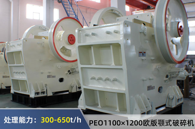 PEO1100×1200欧版颚式破碎机进料口尺寸1100×1200mm,进料粒度≤930mm,排料口范围150-275mm,每小时生产能力在300-650吨,采用185-200kw的电机。