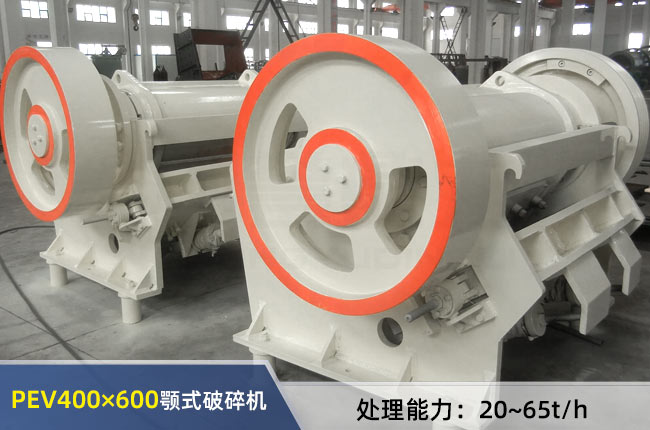 PEV400×600颚式破碎机时产20-95吨,电机功率为30或37千瓦,进料粒度要求<340mm,出料范围40-80mm,重量是7吨,外形长2500mm,宽1750mm,高1950mm。