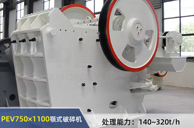 750×1100破碎机指PEV750×1100颚式破碎机,进料口允许通过不大于640mm的物料,排料口调整范围在80-190mm之间,一小时产量可达到140-320吨,所配置的电机功率为90-110千瓦,外形尺寸长宽高分别是3750mm,2580mm,3180mm,重量约26吨左右。