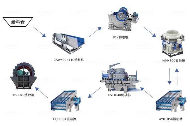 方案二:适合原料粒度≤300mm,采用破碎机、制砂机、振动筛和输送机工艺,破碎机负责破碎、制砂机细碎制砂。