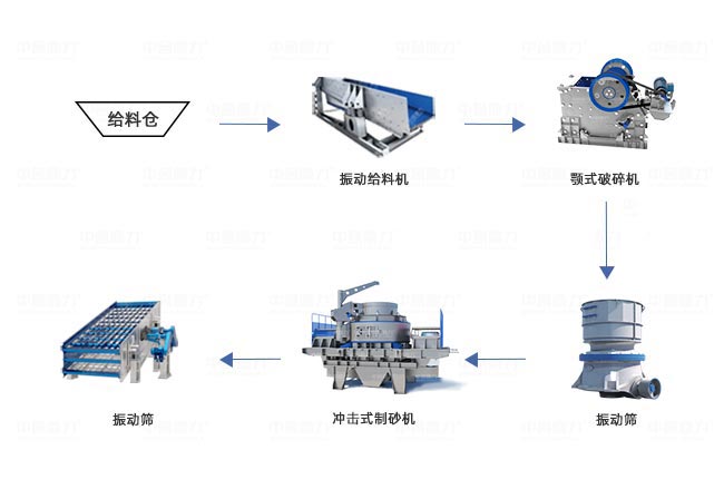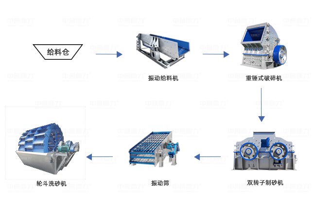 设备配置:原料仓、ZGC0938振动给料机、PCZ1308重型锤式破碎机、ZSJ1213双转子制砂机、2470振动筛、3020轮式洗砂机、输送机